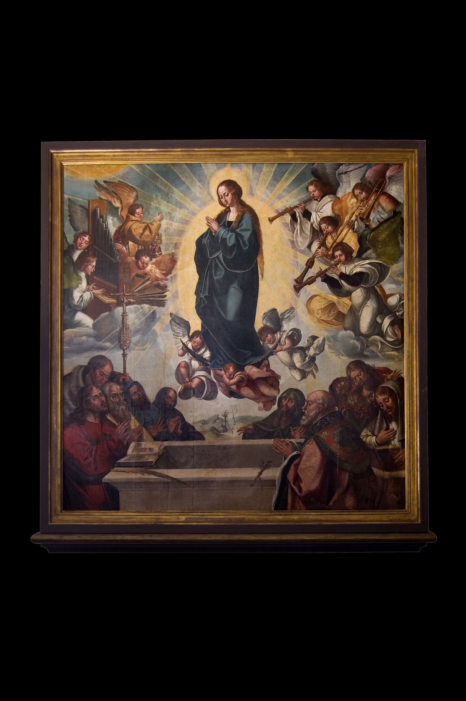 Possivelmente encomendada pelo padroeiro da igreja, Infante D. Luís (cujas armas são visíveis no capuz do pluvial de S. Pedro), representa o túmulo aberto e vazio da Virgem, em torno do qual os Apóstolos recitariam o ofício de defuntos (note-se os livros do Ritual e o hissope pousado no túmulo) e onde assistem à subida da Virgem Maria ao Céu, sustentada por anjos, enquanto outros a ladeiam tocando os seus louvores em diversos instrumentos musicais. Um anjo revestido de dalmática dourada sustenta um turíbulo com que se prepara para a incensar.